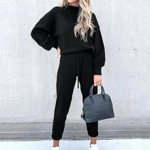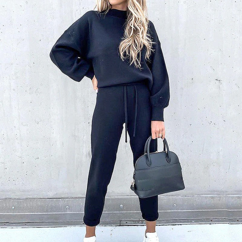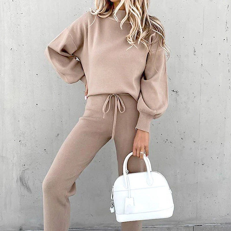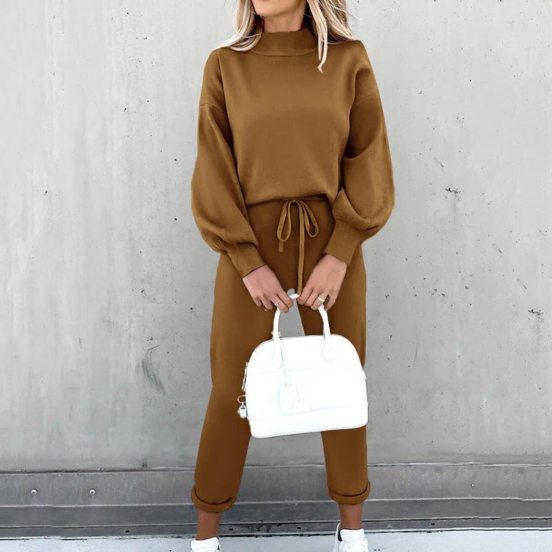 Soft loungewear, ideal for cooler days. The sweater features a turtleneck, balloon sleeves with elastic cuffs and is slightly oversized. The pants are beautifully cut, with a high waist, elastic cuffs and pockets on the back.